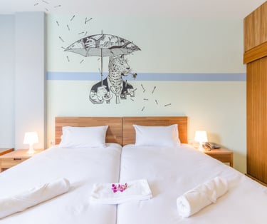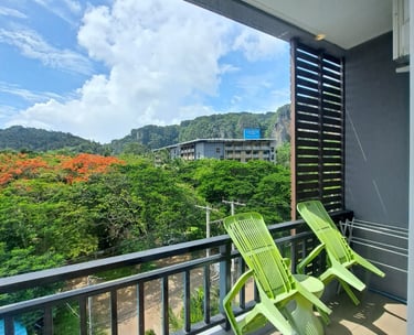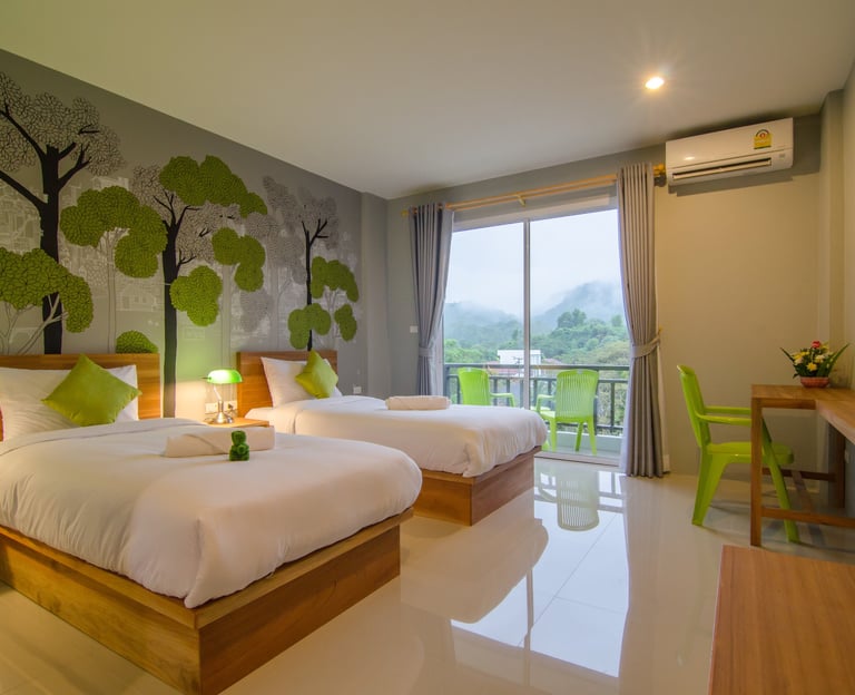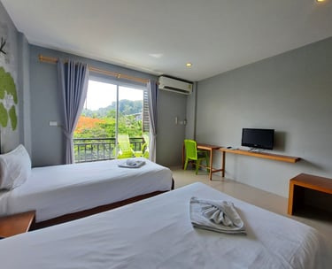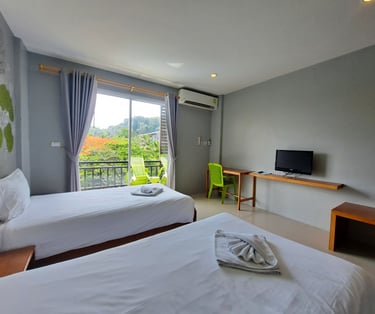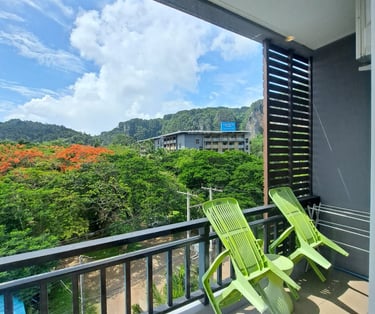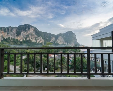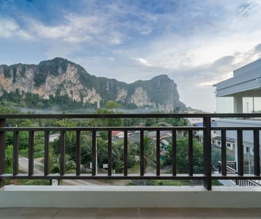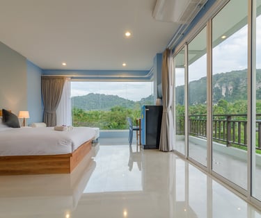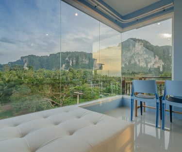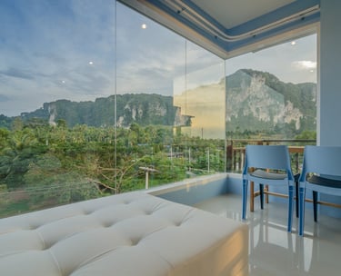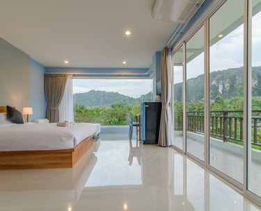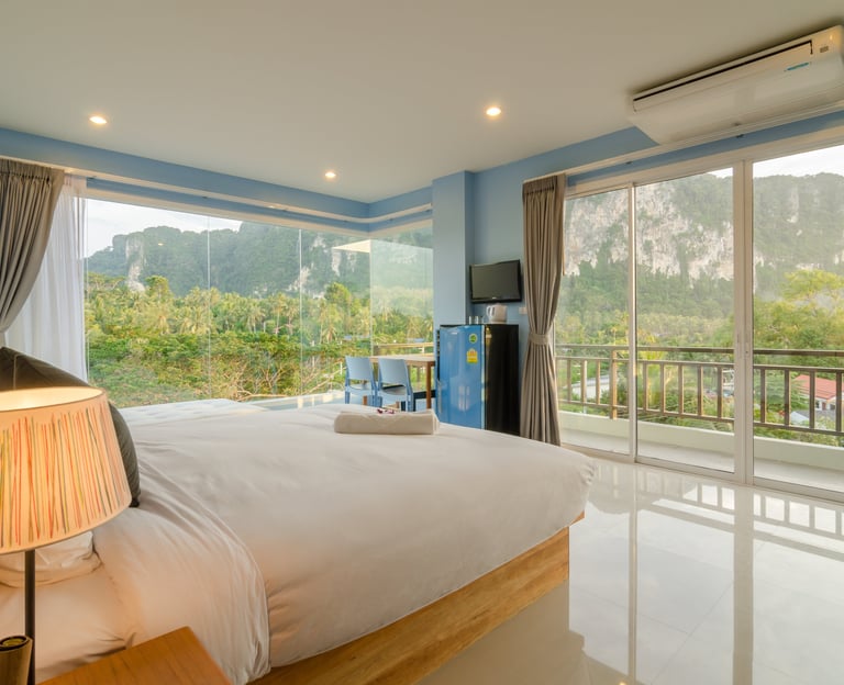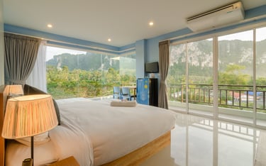 Spacious mountain-view room with floor-to-ceiling windows and a private balcony overlooking limestone cliffs and tropical greenery. Features a king-size bed, A/C, TV, mini-fridge, and a seating area—perfect for unwinding after a day out.