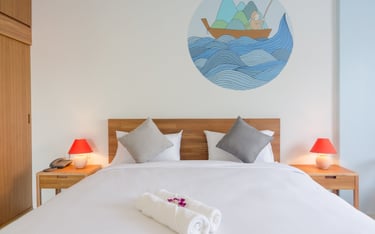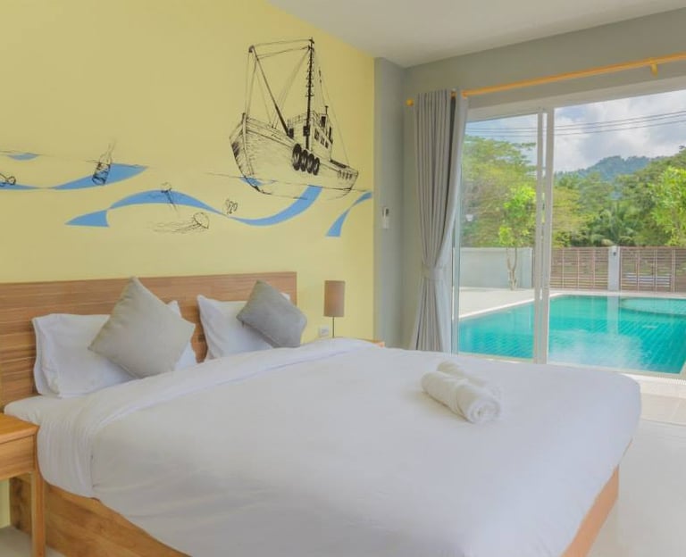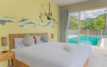 Bright, airy room with a king-size bed. Sliding glass doors open directly to the pool. Enjoy tropical garden and mountain views, with full modern amenities.