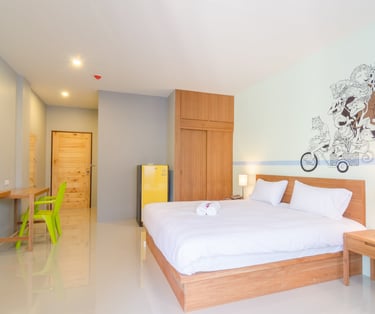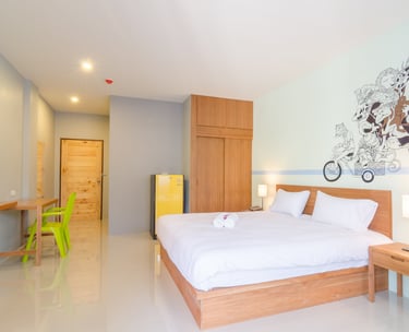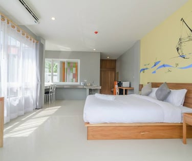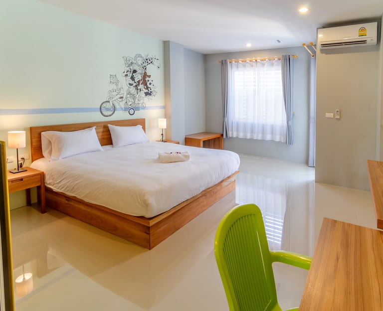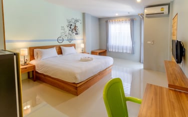 Bright, spacious room with a king-size bed, wooden furnishings, air-conditioning, flat-screen TV, mini-fridge, and work desk ideal for a comfortable stay.